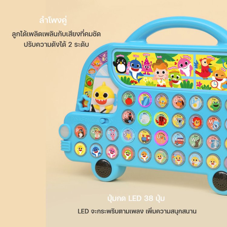 กระตุ้นพัฒนาการด้านภาษาของลูก ร้อง เล่น เต้น สนุกๆ ไปกับ Baby Shark Bus เรียนรู้ ABC, Word, Phonics, Quiz, Song, Light Play มาพร้อมกับหนังสือภาพตัวอักษร คำศัพท์ มีเนื้อเพลงให้ร้องตาม สีสันสดใส น่ารักมากๆ